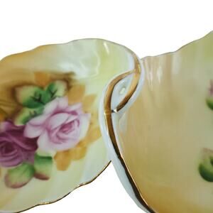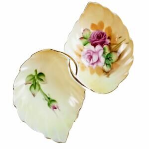 Vintage hand painted double leaf trinket dish by Lefton. As per the label this item was made between 1960-1983. In overall Good condition, no chips or cracks. There is some wear to the gold portion.
