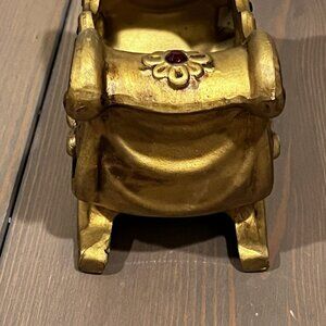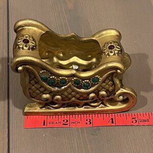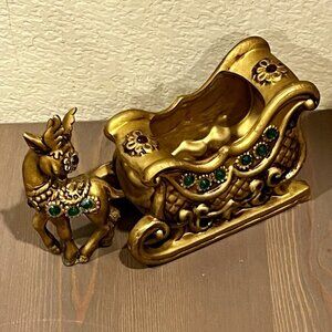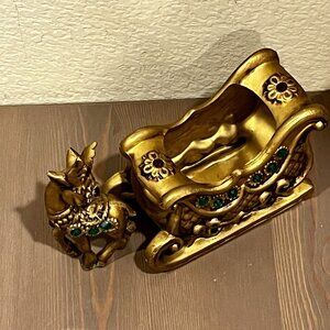 Lefton Gold Sleigh & Reindeer Red Green Jewels Christmas Ceramic w/Sticker Japan