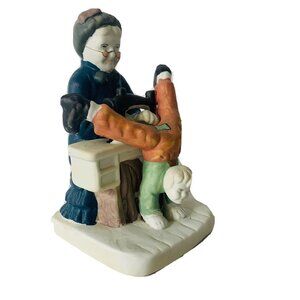 Vintage Lefton Grandma Sewing Figurine – Humorous Boy at Craft Room Decor – 1950s Japan Bisque – Kitsch Collectible Seamstress Gift