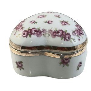Lefton Heart Shaped Trinket Box Pink Flowers Gold Trim Jewlery Box