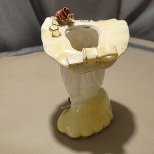 This charming vintage lady head vase from Lefton Japan is a delightful piece of porcelain decor. The exquisite details, such as the flower accents and bow, showcase the artistry of a bygone era. This vase adds a touch of vintage charm to any collection or shelf, embodying the elegance of the past.