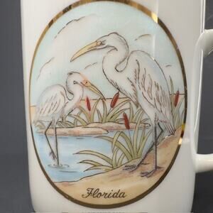 Lefton Japan Souvenir Mug/Cup Florida Egret Waterfowl Birds Gold Trim 1987 VTG