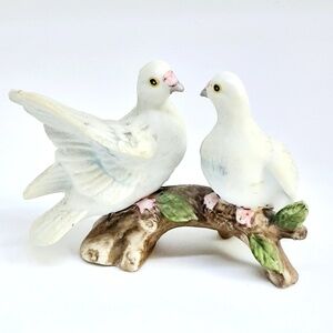 This precious figurine is a pair of love birds, gazing into each others eyes, perched on a branch. These Lefton porcelain bisque doves are so pretty sitting on your shelf. Measures 3 1/4" long, 2 1/2" high. In very good condition with no chips or cracks. Lefton label is missing, but the design number "754" is stamped on the bottom. Comes from a smoke free home. Looking for a new home to be cherished and loved.