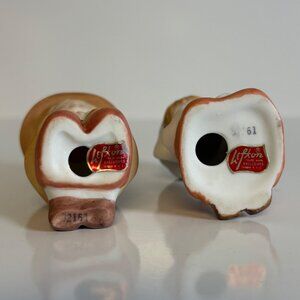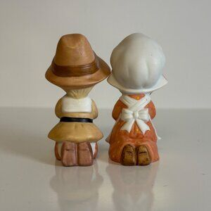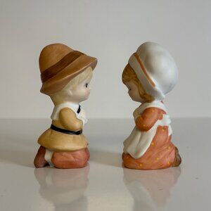 These porcelain figurines by Lefton, depicting a pilgrim boy and girl praying. Ideal for Thanksgiving decor or collectible displays, showcasing vintage artistry.