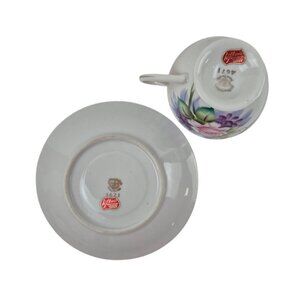 This exquisite Lefton teacup and saucer set showcases intricate hand-painted floral designs, blending elegance and artistry. Perfect for collectors or tea enthusiasts.