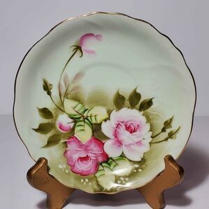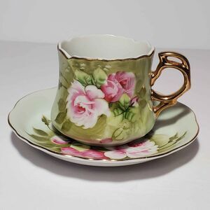 Vintage Lefton Green Heritage teacup and saucer. Pink roses. Hand painted. Few small knicks on underside of saucer. See all pictures.