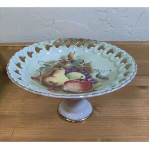 Lefton Vintage Hand Painted Pedestal Pierced Compote Dish Gilded Fruit 7x4"