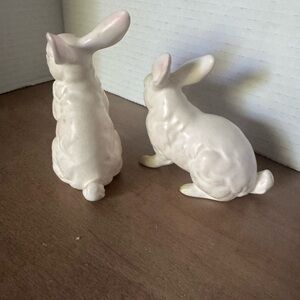 Charming Lefton rabbit figurines. Perfect for holiday decor. Features white bodies with pink accents.