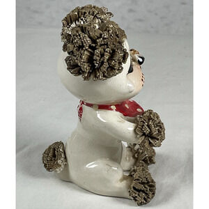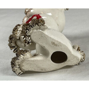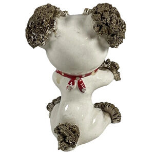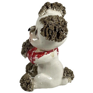 Lefton Vtg Poodle Spaniel Spaghetti Dog Ceramic Bandaged Leg Fly on Nose Figure. This is either a poodle or a cocker spaniel puppy that has the spaghetti style ears and paws. Sits a little under 5 inches tall. One of his legs is bandaged with a red bandana and there is a fly on his nose. Made in a kind of anthropomorphic style. Not marked/signed, but does appear to be Lefton, made in Japan in the 1940s or 1950s (mid 19th century). Pre-owned vintage condition. There is paint wear, especially around the red bandana. There are some discolorations on the glaze, as well as crazing all over. There is one area that looks like paint drops - unsure. No broken pieces. Review photos carefully for all details.