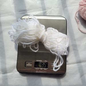 Unsure of brand, but the two do feel similar to each other. These are just leftover yarn. The white skein weights 0.35 oz. The pink one weighs 0.78 oz. Unsure of how much yardage there is of both.