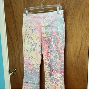 Lefty multicolor marbled high waisted kick flare pants. Hand dyed and one of a kind, made by indie brand. Previously sold at Free People/Urban Outfitters, now only available through custom order. Stretch cotton, elastic waistband. A bit faded in a few spots, but the coolest fun funky pattern.