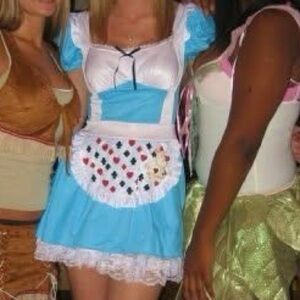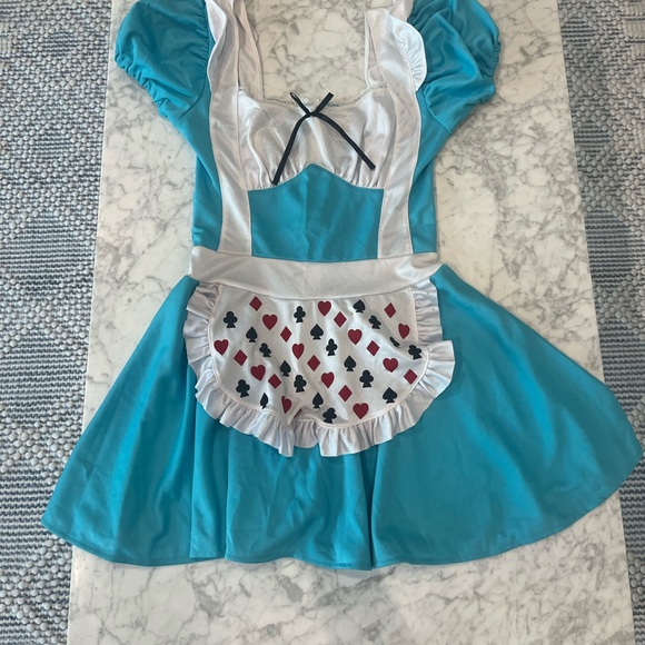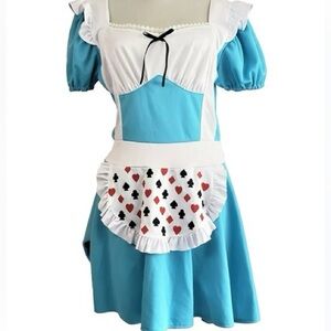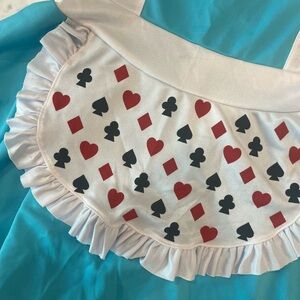 Charming blue and white costume dress. Features playful card suit apron. Perfect for themed events.