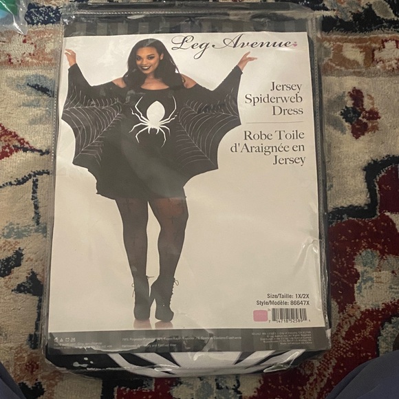 Brand new Leg Avenue Jersey Spiderweb Dress — size 1X/2X. Dress is sealed in original packaging and never worn. Great for Halloween, cosplay, or themed events. Black dress with white spider-web and spider print, stretchy jersey material, and easy pull-on style. One size fits plus-size comfortably. Perfect for spooky outfits, parties, or holiday events!