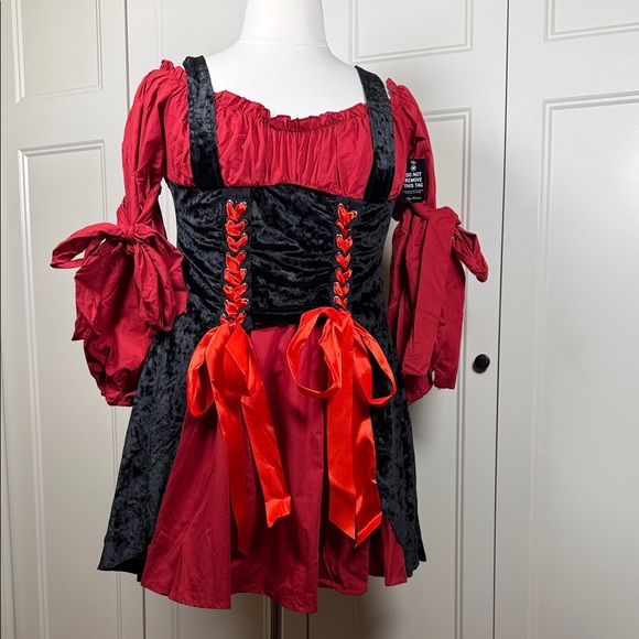 Bold pirate costume with red and black design. Features lace-up details and ribbon accents. Perfect for Halloween adventures.