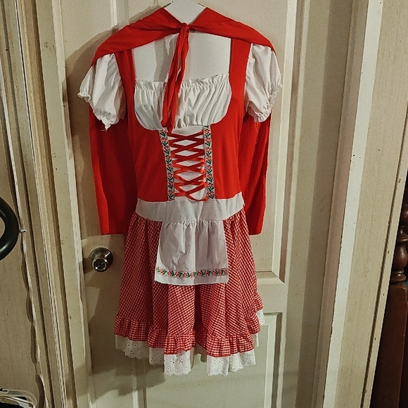 Stylish costume dress with lace-up front. Includes apron and red cape.