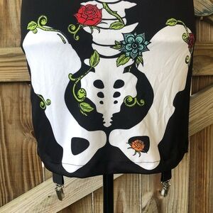 Skeleton Fitted Bodycon Sleeveless Tank Dress / Costume. Black Featuring a Bones-n-Roses Skeleton Design Green Vine Winding Through the Bones with Red, Orange & Blue Flower Blossoms. Bottom of the Dress Has Four Garter Snaps For Thigh High Stockings. Perfect For Halloween or Day of the Dead Party.