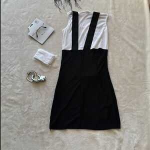 5 items included: Dress ,glasses , badge, handcuffs and white stockings.Please see picture as it has one stains on the white area that I think can be removable .
