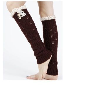 LEG WARMER KNITTED LEG WARMERS LACED TOP BUTTON 8 INCH DIAMETER 16 INCH LONG 100 POLYESTER ONE SIZE. I also have the color brown