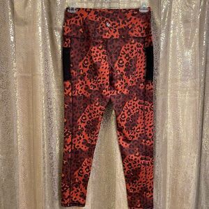 Brand new with tags, bought for myself and never wore. No flaws at all. Smoke and pet free home. Pretty Fall Burnt Orange color with black animal print pattern all over. Black mesh pockets, high rise waist. Material is smooth, stretchy athletic workout material. Size XL. I wear size 14 and these fit me perfect, just tried them on. Great for working out, running, yoga, Pilates, training or any other workout!