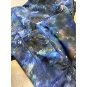 Very Good Preowned Condition, high waist, blue / black foliage print, pockets on side legs, tagged size M, See Measurements for Custom Fit