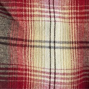 Legendary Outfitters hooded plaid flannel jacket in red, cream, and black. This snap-front shirt jacket features light quilted lining for warmth, dual chest pockets, and classic outdoorsman style. Great for layering in fall or spring and easy to pair with jeans, boots, or casual outfits.