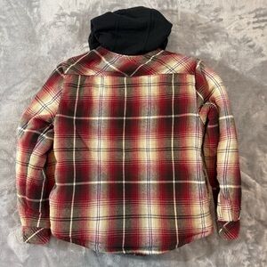Keywords: plaid flannel jacket, quilted shacket, hooded flannel, mens shirt jacket, snap button jacket, red plaid coat, outdoors flannel, casual fall jacket, lightweight quilted jacket, mens small jacket, warm flannel shirt, classic plaid shacket, everyday layering jacket, casual winter shirt, vintage style flannel