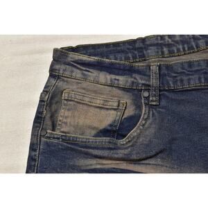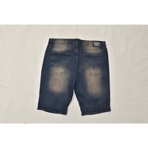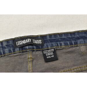 These Legendary Status men's denim jean shorts in a size 42 offer a stylish and comfortable option for casual wear. The shorts feature a distinct blue wash with a faded and distressed appearance, giving them a modern, edgy look. The material is a blend of 98% cotton and 2% spandex, ensuring a comfortable stretch and a great fit. They have a classic five-pocket design with an additional stitched cargo-style pocket detail on the right leg. The closure is a zipper fly with a button. The waist measures approximately 21.5 inches laying flat, which corresponds to the size 42 on the tag. The inseam is approximately 11.5 inches, hitting around the knee. The shorts are in excellent used condition with no visible stains, rips, or tears. Please review all provided images for a detailed look at the item's condition and measurements.