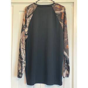 Does have several snags from outdoor wear (fishing/hunting/hiking). no holes, no stains. great to wear over a t-shirt or under a button up. camo sides and sleeves, black torso.