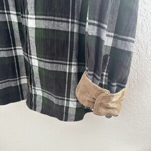 Classic flannel shirt, ideal for layering or wearing on its own. This shirt features a green and white plaid pattern, offering a timeless and versatile look. It has a button-down front, long sleeves with buttoned cuffs, and a chest pocket for added functionality. The shirt also has a corduroy trim on the inside of the collar and cuffs, adding a touch of texture and durability. This flannel shirt combines comfort and style, making it a great choice for everyday wear.