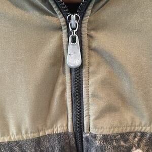 Excellent pre-owned condition Legendary Whitetails mid-weight fleece zip front jacket. This is great option for the outdoorsman as it can be worn as jacket or zip off the sleeves for a vest. Men’s size large in classic army green and brown, gray and tan leaf print camo. Can be worn for hunting or any casual outing. Interior nylon lining in same green as panel on front and back. Nylon on back of jacket also features subtle two-tone camo print. Lots of pockets for storage, one at chest with full zip and two at hip with full zipper closure as well. Has cinch cords at bottom hem to cinch and adjust as needed, same detail at zippers on pockets. This jacket/vest is a closet staple for wear throughout fall and into winter in some climates. No flaws other than metal zipper appears worn as shown in photos but works as it should so does not detract from the overall look of the piece and otherwise does not impact wearability.