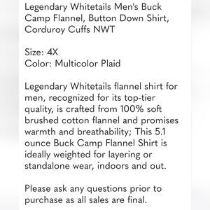 Legendary Whitetails Men's Buck Camp Flannel, Button Down Shirt, Corduroy Cuffs NWOT