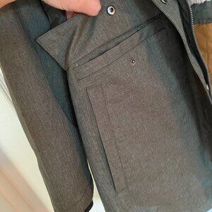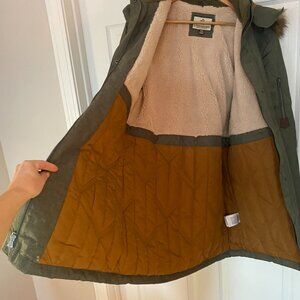 Removable faux fur lined hood. Deep side and front pockets. Zippered pocket on arm.