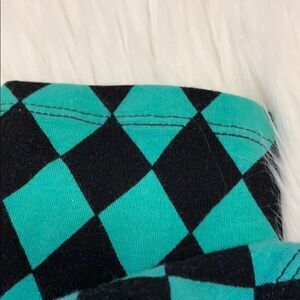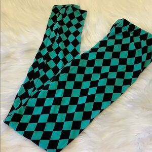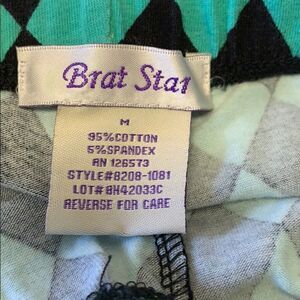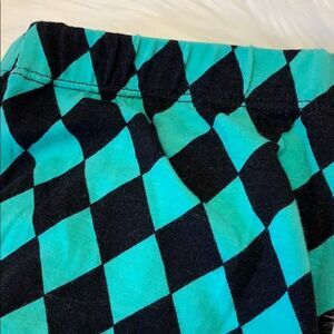 Cute lightweight leggings are a sherbet green and black. Elastic waist. Waist across, not stretched, is 11”. Inseam is 28”.