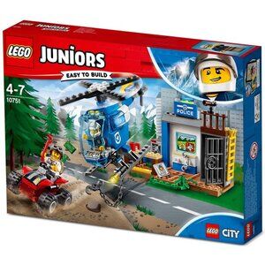 Be a hero of the LEGO City Mountain Police Force with the LEGO® Juniors/4+ 10751 Mountain Police Chase set! This cool police chase toy features an Easy to Build police helicopter with opening minifigure cockpit, spinning rotors and a chain with hook, as well as a police station toy with desk, opening safe and jail cell with opening door, and a quad bike. This action-packed starter set also includes a simple guide to build and play, with bigger starter pieces to help build confidence in younger children. Includes 2 minifigures.