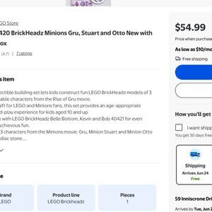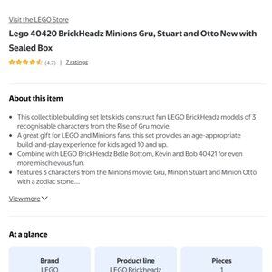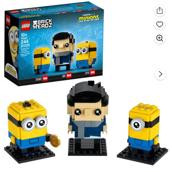 LEGO 40420 Gru, Stuart and Otto is a 244-piece BrickHeadz set that was released in 2021. The set features three characters from the Minions movie: Gru, Minion Stuart, and Minion Otto. The set was retired in January 2023. The set is suitable for children aged 10 and up. It comes with a sturdy baseplate for easy display, either individually, as a group, or alongside other BrickHeadz models. The set can be combined with LEGO BrickHeadz Belle Bottom, Kevin, and Bob 40421 for even more fun.
