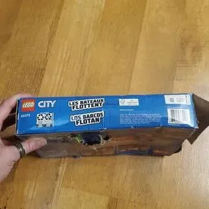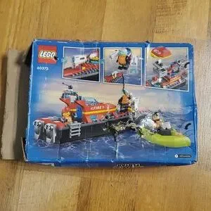 This Lego Fire Boat set is brand new inside and has all parts including boats and sealed bags. The box is NOT in good condition because of tears and poked holes. We also slit open one side so that we could verify all bags are inside and new. 2 instruction books, stickers, 2 bags and 2 boats are all in there.