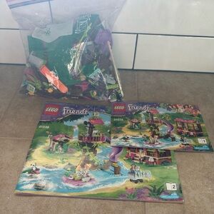 Lego Friends Jungle Rescue Base Set. Embark on a jungle rescue mission. Cordinate your animal rescue missions at the LEGO Friends Jungle Rescue Base! Help Andrea climb the watchtower and use the telescope to look for animals in danger. Theres a panda that needs your help! With LEGO Friends Jungle Rescue Base slide Andrea down to the rescue boat, rescue the panda in distress and help Stephanie check it over in the mobile medical station. Jump on the zip line to slide down to the living quarters. Take a shower in the bathroom at the end of an exciting day and help the girls cook and eat dinner together with the animals before heading to bed for a good nights sleep. Theres another busy day of animal rescue in store tomorrow with LEGO Friends Jungle Rescue Base! 473 pieces. Good used condition