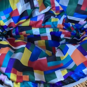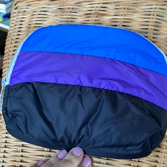 Target LEGO, Puffy, small cosmetic or pencil bag. Black, purple and blue stripped. Inside is lined with multi color brick shapes and Lego-Target logo. Zippered closure.