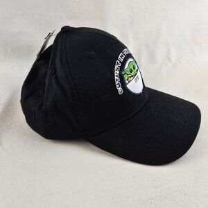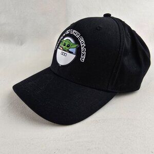 Adorable youth hat featuring Grogu (Baby Yoda) from The Mandalorian with “Cutest in the Galaxy” text design. Adjustable snapback closure with olive green interior detailing.