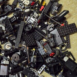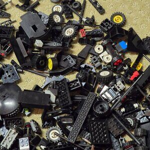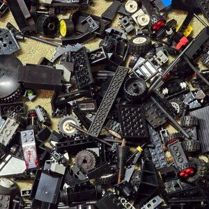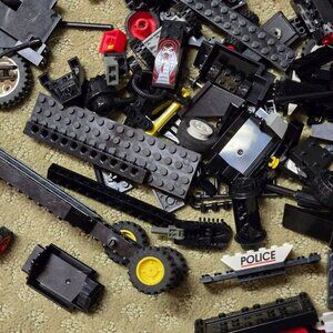 Great lot of black parts and pieces in official lego and lego compatible shapes and sizes. Lots of Wheels and car pieces, bricks, flat pieces, arches, ladders, car parts, plane parts, minifig parts, and various accessories. Please refer to pictures of actual lot.