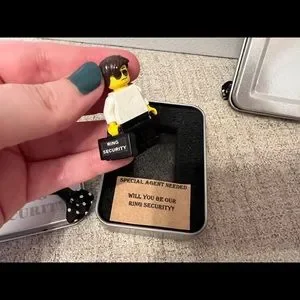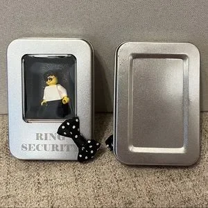 Brown haired Lego figure. Suitcase that says “ring security”. Metal tin. Padded inside. Card on the inside says: “special agent needed. Will you be our run security?”