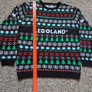 The product is a colorful Legoland Ugly Christmas Sweater in size XXL for men. It features a graphic print pattern with a tight-knit design, long sleeves, a crew neckline, and a classic fit. The sweater is made of polyester fabric and is machine washable. With a festive Christmas theme, this pullover sweater is perfect for holiday celebrations, casual wear, or as a gift for someone who loves Legoland or is a fan of colorful and quirky outfits. It is a fun and playful addition to any winter wardrobe.
