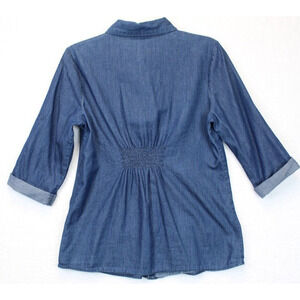 L.e.i Button Front Blouse Junior Large Roll-Up Sleeves Elastic Chambray Blue
