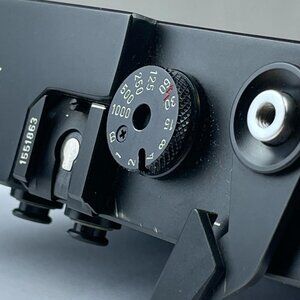 Condition: visually very good, only minor signs of wear under the winding lever, on the back cover, and on the eyepiece. (see photos) Technically, everything works as it should, all clocks are running smoothly. I had a few instances of light leakage when I left the camera without a lens cap for a long time (see the last two photos!). The viewfinder has no mold, etc., and is generally transparent.