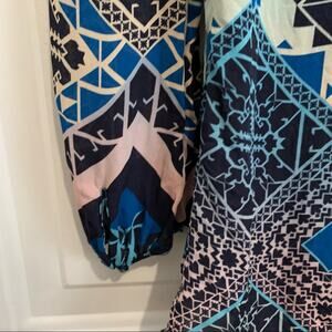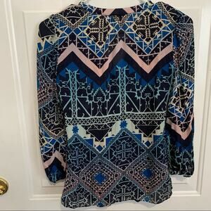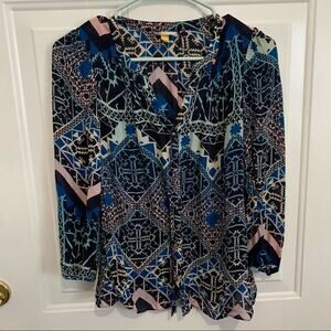 From Anthropologie brand Leifsdottir - a beautiful silk shirt, patterned in shades of blue and pink. Button front, sleeves have button closure. Semi sheer. Very good used condition.