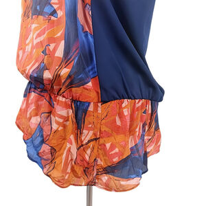Make a statement with this vibrant Leifsdottir blouse sold through Anthropologie. This sleeveless top features a bold red, orange, and blue abstract floral print on a 100% silk overlay with an asymmetric draped front. The back is crafted from a navy stretch blend for added comfort and structure. The bubble hem gives it a flattering blouson silhouette, perfect for pairing with dress pants or jeans. Elegant yet edgy, this top is ideal for both work and weekend outings.