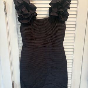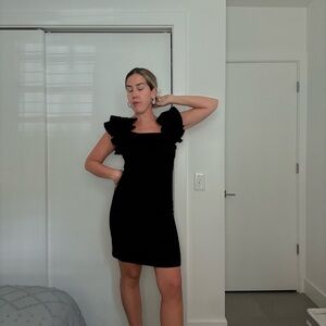 Chic black mini dress by Leifsdottir. Features stylish ruffle sleeves. Perfect for any event.