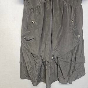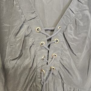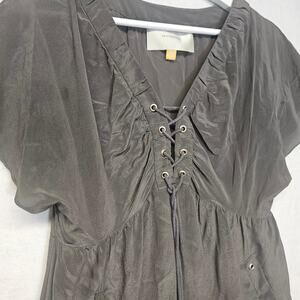 Leifsdottir Brown Silk Tiered Babydoll Dress in excellent condition. This dress features a brown silk with a tiered bottom, a lace-up V neckline front pockets, short Dolman style sleeves and a cute empire waist/babydoll style. Made of 100% silk. Unlined. Retail price for this beauty was $278.