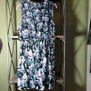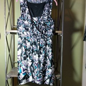 Black 100% silk dress with a feather pattern of purple, teal , and cream, double straps pic 4, half wrap in front with a blue trim acetate lining, 2 side pockets, 18" pit to pit, 36" long, worn once