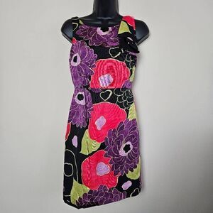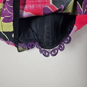 This is a vintage Sheath Dress by Leifsdottir, an Anthropologie brand. It is black with purple, red, and green floral print. This dress has a black lining underneath with purple lace crochet details. There is a zipper on the back, and one shoulder strap has a ruffled detail, as shown in the photos.